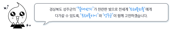 야생화식물원에서는 연중 아름다운 꽃들을 만날 수 있다.옛 성산가야의 터전이었던 곳으로 알려진 성주는 여러 문화유적을 간직한 고장이다. 성주에서는 특히 가야의 순장 풍습을 알 수 있는 고분들이 많이 발견되는데, 이 중 대표적으로 가야시대 지배집단의 무덤으로 추정되는 성산동고분군을 중심으로 생(生)과 활(活), 그리고 사(史)가 오롯하게 얽혀 있다.
