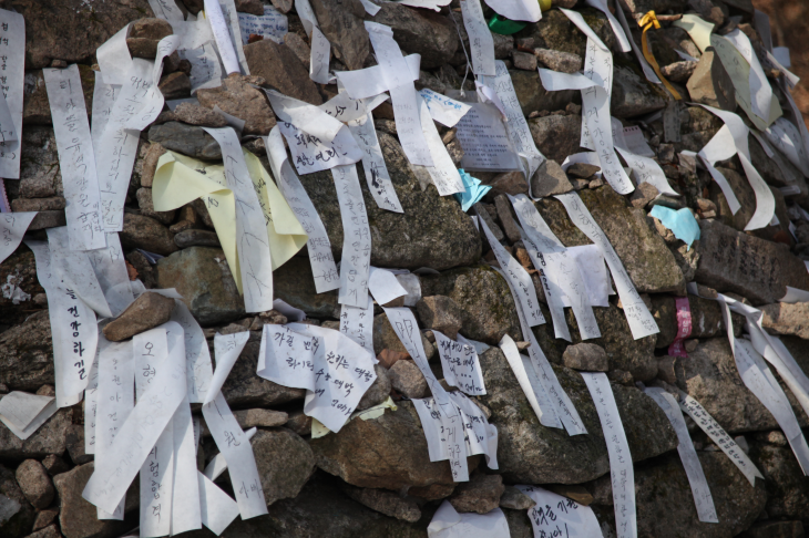 책바위에는 자녀의 건강과 좋은 성적을 염원하는 부모들의 소원 리본이 달려져 있다.