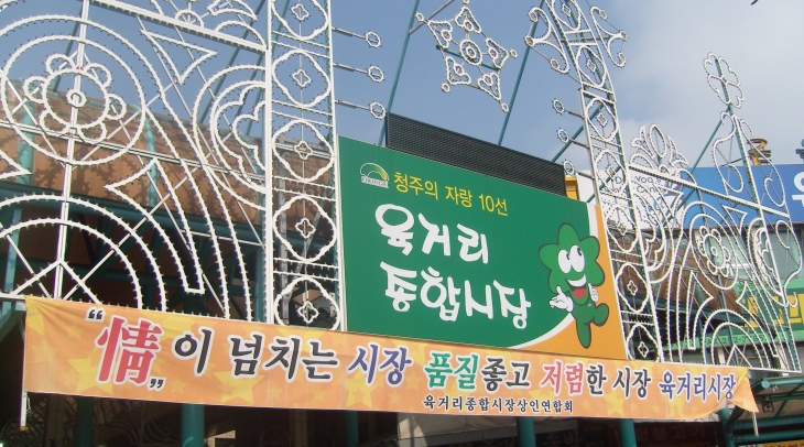 청주 육거리시장에 당도하면 쉽사리 이름의 유래를 깨닫게 된다. 교차로가 하나도 아니고 여섯 개가 겹쳐져 있어 이 일대에 익숙하지 않은 사람이라면 운전하기도 어려워 보이는 이곳. 이 여섯 개의 길이 모이는 곳 중 한쪽에 육거리시장이 세워져 있다. 이 육거리시장은 구한말에도 있었다고 전해진다. 무심천 주변에 우시장이 들어서며 자연스럽게 교역이 이루어지는 장소가 되었다는 것이 그 유래. 그러나 현재의 시장을 이루게 된 역사를 따진다면 50년대 이후로 잡아야 한다. 남북으로 길쭉하게 발달했던 시장이 한국전쟁을 겪으며 동쪽에서 서쪽으로 점차 점포들이 들어서게 되었기 때문이다. 그러나 바둑판처럼 복닥복닥 복잡했던 시장이 보다 고객 친화적으로 변한 것은 2002년부터의 일이다.