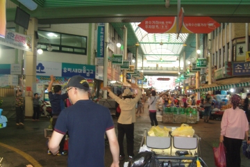 전통시장을 사람들이 덜 찾게 되는 이유는 무엇일까? 비 오는 날이면 고스란히 비를 맞아야 하는 상황이 싫을 수도 있고, 카드나 상품권을 쓰기 힘든 결제환경을 말하는 사람도 있다. 한편으로는 대형 마트에서 장을 볼 때와는 달리, 무거운 장바구니를 끙끙거리며 끌고 다녀야 하는 것 자체를 달가워하지 않은 경우도 있다. 이런 점에서 청주 육거리시장은 상대적으로 빨리 현대화된 전통시장으로 자리 잡았다. 편리함과 전통을 함께 갖춰 주민들만이 아니라 여행객들도 드나드는 시장인 만큼 다채로운 풍경도 많다.