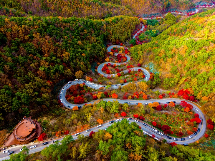 단양강의 은빛 물결과 단풍옷을 입은 산자락, 보발재를 붉게 덮은 단풍빛이 한 폭의 그림처럼 어우러지며 지난 주말부터 단양군 주요 관광지는 인파로 가득 찼다. 도담삼봉 일대는 새벽부터 삼각대를 세운 관광객들로 붐볐고, 물안개 사이로 떠오르는 햇살과 세 봉우리가 어우러진 풍경은 그야말로 환상 그 자체였다. 보발재 단풍길에서는 차창 밖으로 흩날리는 낙엽이 가을의 향기를 가득 전한다. 이 길을 찾은 운전자들은 “단양은 달리는 내내 풍경이 바뀌는 곳”이라며 감탄을 쏟아냈다. 해발 600m 고갯길을 따라 붉게 물든 단풍터널이 이어지고, 자동차 창문을 열면 낙엽 향이 그대로 스며든다. 지난해 새로 개장한 보발재 전망대에 오르면 단양의 산과 강이 한눈에 내려다보이며 가을빛으로 물든 절경이 펼쳐진다.