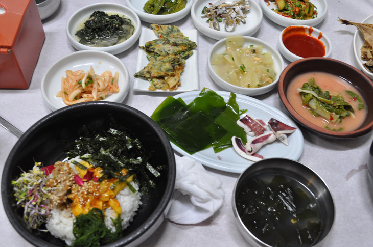 참기름과 채소를 넣어 비벼 먹는 멍게비빔밥은 봄철 별미로 인기가 높다.