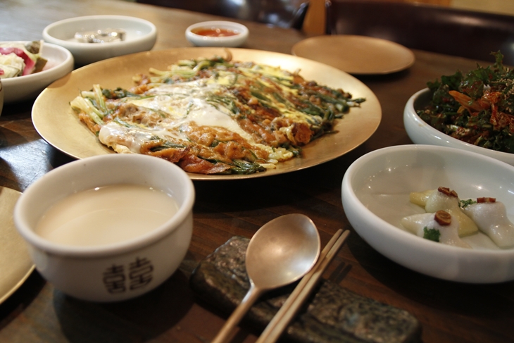해산물이 풍부하게 들어간 동래파전, 막걸리 한 잔을 곁들이면 더 부러울 것이 없다.