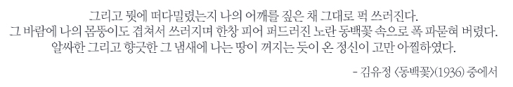 애향심이 작품 속에 그대로 남은 소설가 김유정, 그리고 오늘날 그 고향과 후손 역시도 그에게 깊은 존경과 애정으로 보답하고 있기에 실레마을에는 꽃이 핀다. 김유정의 유품을 정리한 이들이 모두 월북하는 바람에 흔한유품 하나 보유하지 못했지만, 실레마을은 주옥같은 소설 구절과 마을 귀퉁이에 유품보다 더 생생한 김유정의 숨결을 지니고 있다. 노란 동백꽃의 수수께끼를 두 눈으로 직접 확인하러 춘천 실레마을로 가보자. 누가 알 일인가, 닭을 쫓는 ‘점순이’를 혹은 주막에서 코다리를 뜯고 앉은 김유정을 만나게 될지.