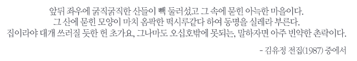 주변에 빼곡히 둘러싼 산 속에 있는 실레마을을 두고 김유정은 이렇게 적었다. 1987년 출간된 <김유정 전집>에 실린 그의 생전 글이다. 필시 드나들기 힘든 두메산골이었을 것이나, 그 조차도 ‘옴팍한 떡시루'라 다정히 불렀던 이들의 마음도 다정하게 느껴진다. 지금은 통째로 김유정의 고장이 된 이 마을에 들어서면 소설에 등장하는 곳임을 알리는 표지판이 심심찮게 보인다. 예를 들면 ‘<봄·봄>의 무대, 점순 네 집 터’ 같은 식으로, 금방이라도 점순이가 닭을 안고 튀어 나올 듯하다.