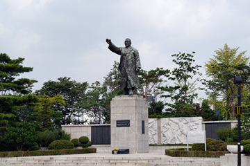 '남산 둘레길' 초입에 위치한 백범 광장(좌)과 안중근의사기념관(우)의 모습.남산 둘레길에 들어서는 진입로는 공식적으로만 무려 15개다. 보통 서울역, 회현역, 명동역 등 지하철역이 출발점으로 많이 이용된다. 이 중에서도 서울역과 명동역이 가장 많이 애용되는데, 서울역에서는 10번 출구 또는 11번 출구, 명동역에서는 1번 출구로 나와 N서울타워를 보며 걸으면 된다. 서울역에서 소월로를 따라, 명동역에서 소파로를 따라 얼마간 걷다 보면 넓은 야외 광장을 만난다. 백범 김구 선생의 동상이 세워져 있는 ‘백범 광장’이다. 백범 광장 뒤로는 안중근의사기념관과 남산도서관이 자리 잡고 있다.