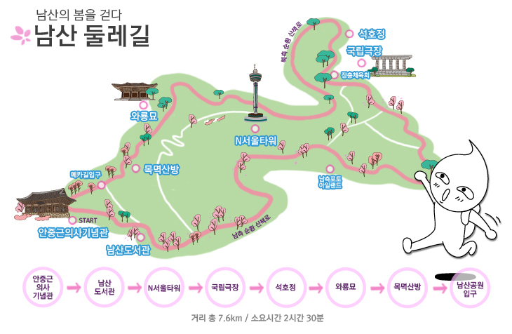 안중근의사기념관 관람을 마쳤다면 본격적으로 ‘남산 둘레길’에 들어설 차례다. ‘남산 둘레길’은 크게 ‘남측 순환산책로’와 ‘북측 순환산책로’로 나뉜다. 남산공원에서 N서울타워를 거쳐 국립극장까지 이어지는 남측 순환산책로는 봄철 피어나는 벚꽃으로 이름난 곳. 일제강점기 일본이 장충단 공원 등을 조성하며 일대에 일본의 국화인 벚꽃 수천 그루를 심었다고 전해지는데, 이 때문에 일각에서는 ‘일제의 잔재이기 때문에 없애야 한다’는 주장도 있었다.