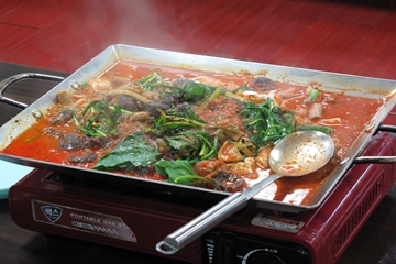 지동시장의 명물인 순대볶음. 순대타운에는 곱창, 순대국밥을 먹기위해 찾는 사람도 제법 많다.못골시장에서 수원천을 따라 북쪽으로 따라 올라가면 얼마 못가 나오는 지동시장은 100년이 넘는 역사를 자랑하는 곳으로 과거에는 보부상들이 활동했던 시장이다. 수원시 지동에 있어 지동시장이라 불리며 건어물, 정육, 수산물, 채소 등 식품으로 특화해 수원뿐만 아니라 용인 등 인근 지역 사람들이 찾아온다. 이곳 역시 리모델링을 거쳐 보다 쾌적한 전통시장의 모습을 갖췄다. 전통시장으로는 최초로 콜센터도 운영하고 있다. 지동시장의 명물은 무엇보다 순대와 곱창가게 40여 군데가 모여 있는 ‘순대타운’이 있다. 또 순대타운은 화성을 찾는 이들이 식사를 해결하기에 안성맞춤이다. 저렴한 가격과 푸짐한 양이 먹기 전부터 배부르다. 순대타운 각 점포들은 20년 이상 된 곳으로 모두 한 번쯤 TV에 소개된 적이 있을 만큼 맛 또한 뛰어나다. 순대국밥, 순대볶음, 곱창볶음이 주 메뉴. 순대타운 외에도 곳곳에는 좁은 공간에서 풍겨오는 노릇노릇한 전 냄새, 가지런하게 진열된 시장 도넛과 손만두도 입맛을 돋운다.