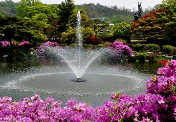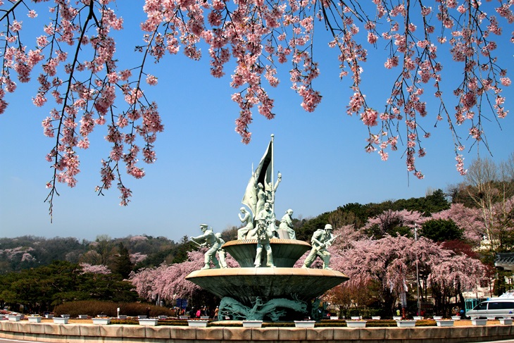 입구에 들어서면 충성분수대 주변으로 수양벚꽃길이 시작된다.