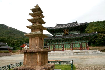 도갑사 오층석탑 뒤로 대웅보전이 보인다.